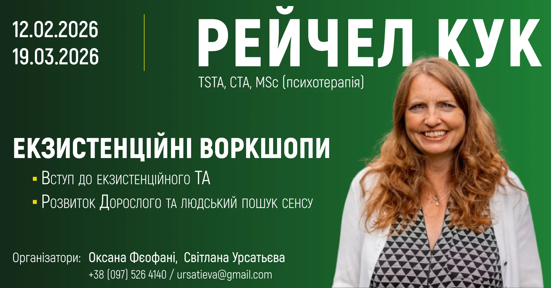 У цих двох воркшопах Рейчел Кук (TSTA) спирається на матеріали своєї новаторської нової книги «Екзистенційні перспективи в транзакційному аналізі: розвиток Дорослого «Я» та людський пошук сенсу», щоб представити свою модель розвитку дорослої особистості та потужну концептуальну рамку, яка допомагає нам і нашим клієнтам орієнтуватися в темах існування та проживати життя повніше й осмисленіше через п’ять різних етапів дорослого життя.